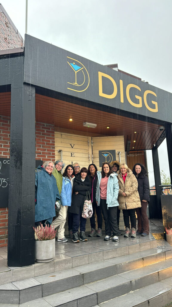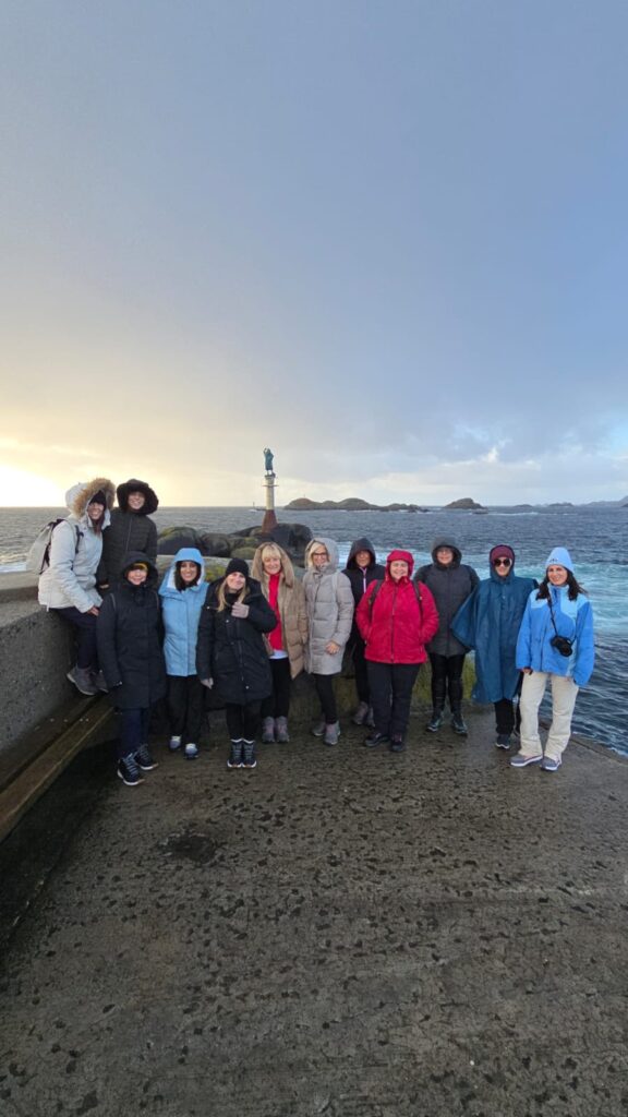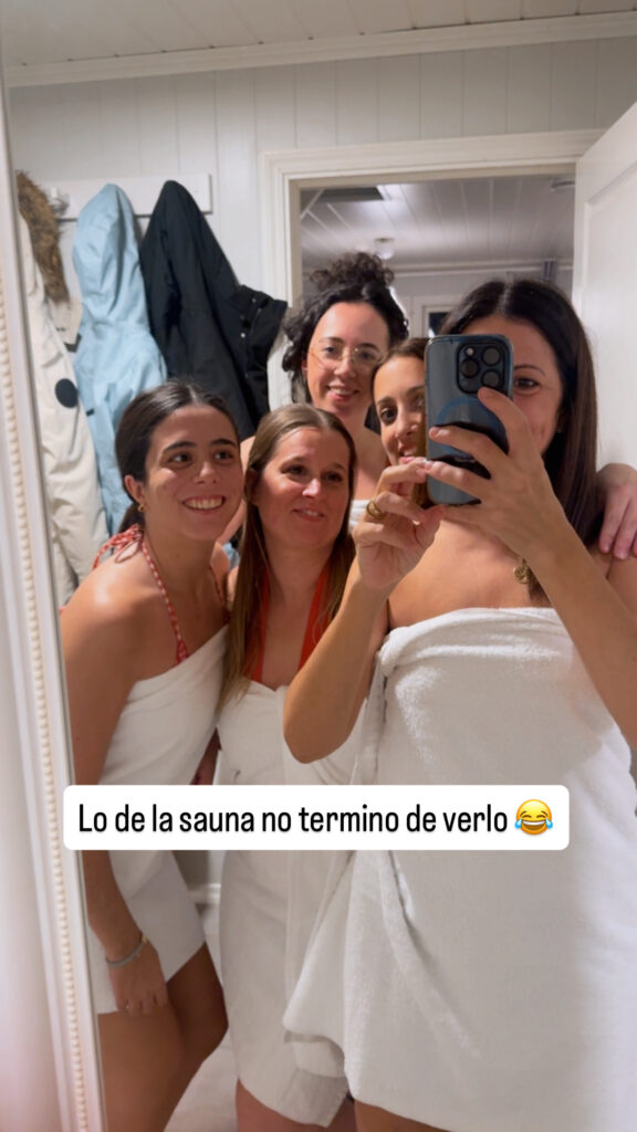 Lo bonito de este viaje no han sido solo los paisajes y las sensaciones, sino la compañía y los recuerdos que hemos ido creando juntas, porque la sauna nos la hicimos Rocío, Lucía, Cristina, Paula, Iris y yo, pero siempre recordaré a Isa, con el chaquetón puesto, dentro de la sauna, sacándonos fotos. Y luego salió y, junto a Ángeles y Mila, nos grabaron y nos hicieron un montón de fotos. A las pobres las recuerdo con el gorro chorreando, porque llovía, cómo no, cámara en mano, armadas de su santa paciencia mientras nosotras les pedíamos una foto más, un vídeo más… Y fue un descojone, pero que se quedaron heladas, pues también. Así que muchas gracias, chicas.