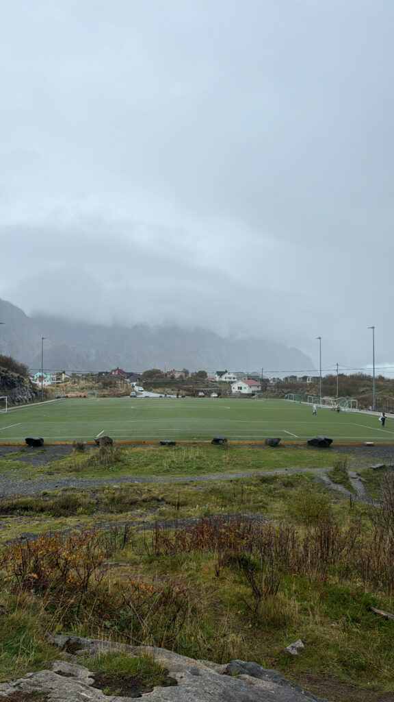 En Henningsvaer, un pueblecito de pescadores, también nos llovió, cómo no. Allí nos tomamos un café, recorrimos la calle principal, que está llena de tiendecitas, y después vimos el campo de fútbol, que es gigante. Igual lo has visto en fotografías o en algún post de IG, porque es como algo muy significativo de ese lugar.