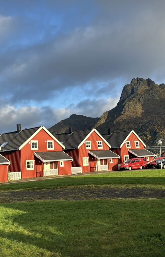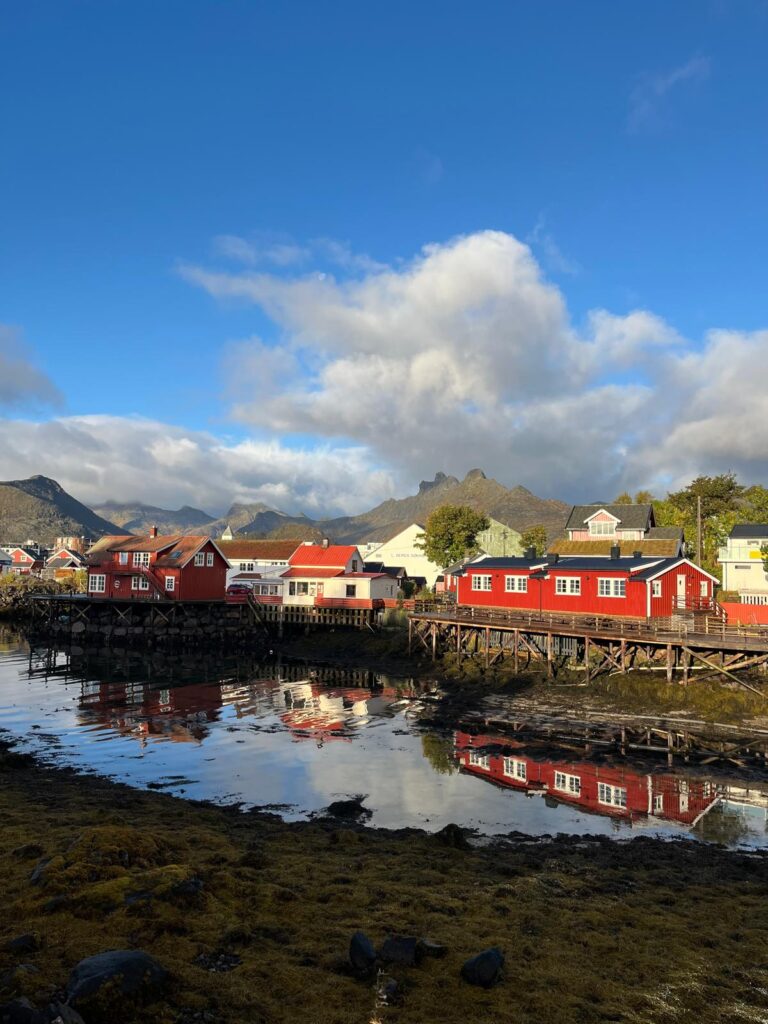 Y ahora, un apunte. En las Lofoten los pueblos no se parecen en nada a los nuestros. Son muy pequeños, cuatro calles y poco más. Las casas son todas de madera, muy bonitas, como de cuento, generalmente de colores (rojo, mostaza, verde…) y con techos a dos aguas; además, tienen jardín y están muy separadas las unas de las otras. Algunas incluso están tan alejadas que están rodeados por árboles, en plena naturaleza. Y todas, todas, tienen lamparitas o bombillas colgando en las ventanas, además de figuritas, plantas o velas en los alféizares. Y no tienen cortinas, porque no tienen nada que ocultar… jajajajaja.