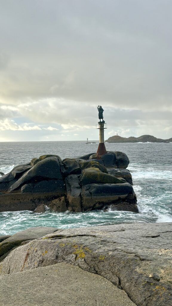 Recuerdo que, cuando estábamos saliendo de ese tipi gigante, miré el cielo y lo maldije un poquito porque iba a llover de nuevo y no hacía falta ser muy lista para darse cuenta. Así que, sin esperar a nadie, empecé a andar hacia el final del espigón, donde se encuentra la Fiskerkona, la esposa del pescador que saluda a los marineros.