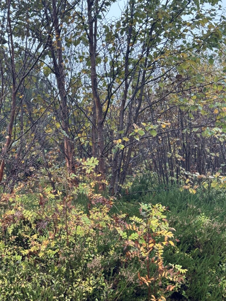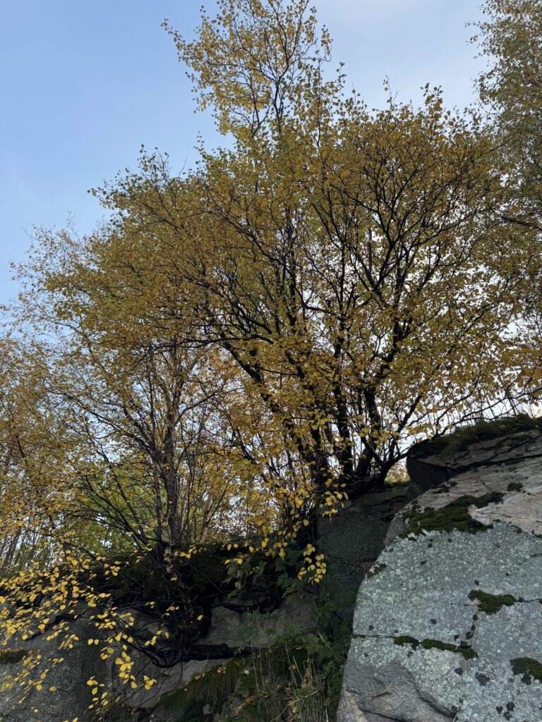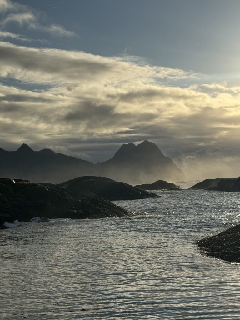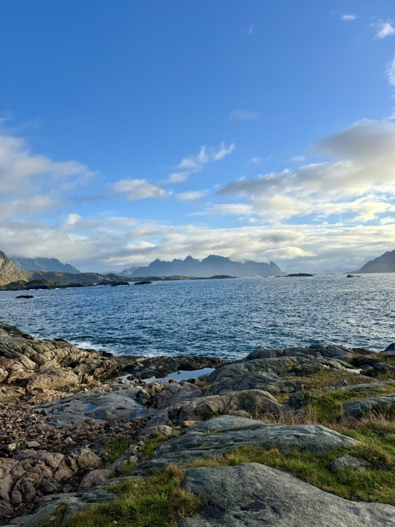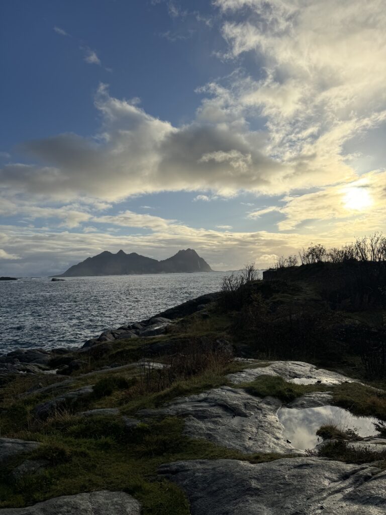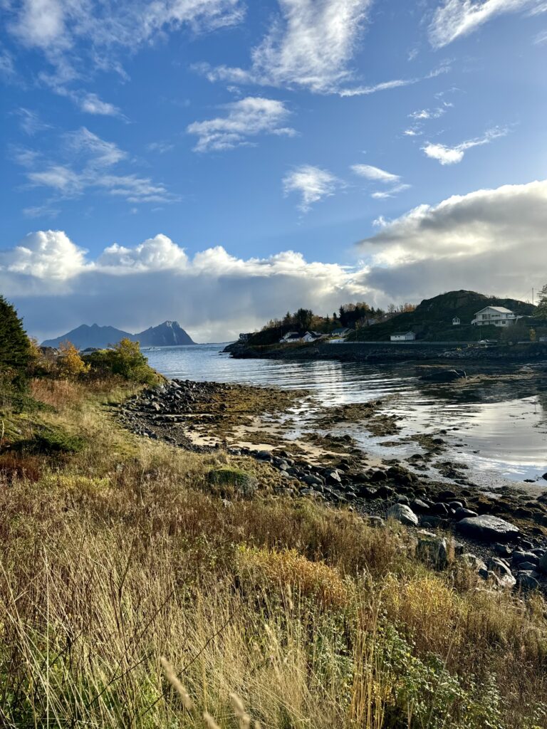 Amanecimos en la casita de madera, que era superbonita, desayunamos y nos fuimos a dar un paseo. Y menudo paisaje teníamos a dos pasos de nuestra cabaña: las rocas negras formando un acantilado rocoso; el agua agitada rompiendo en ellas; las montañas puntiagudas a lo lejos; las nubes cubriendo sus picos, como una bufanda que envuelve tu cuello; los abedules, algunos todavía con las hojas amarillas, otros ya sin ellas, y luego el sol, cuando salió y dibujó un camino dorado sobre el agua, pintando el verde de más verde, el ocre de más ocre, el rojo de las cabañas de más rojo… y así con cada tono, que eran muchos.