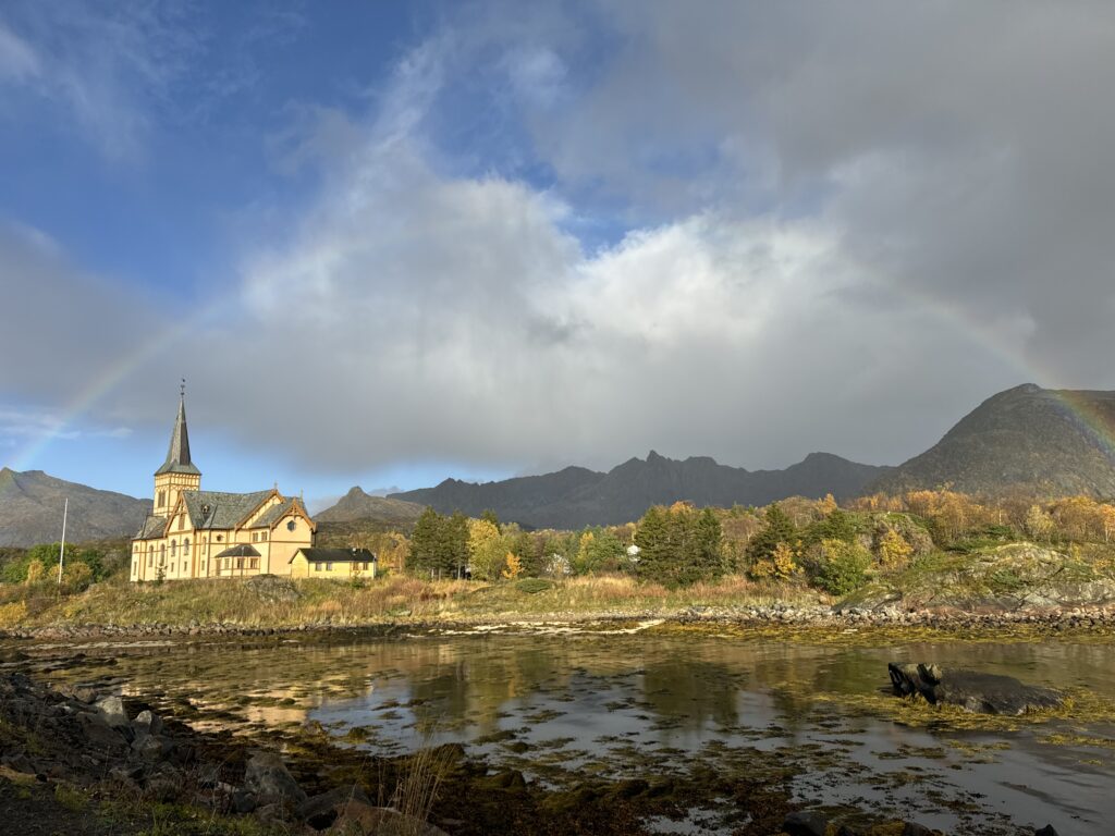 Luego volvió a salir el sol y con sus rayos visitamos, solo por fuera, porque estaba cerrada, la Vågan Kirke, también llamada la catedral de las Lofoten, en Kabelvåg, donde vimos un arcoíris completo. Y, bueno, ya sabéis que, cuando dos personas, que comparten cierto vinculo de cariño, lo ven, tienen que darse un beso en memoria de Baldur. Y creo que Nico se llevó uno. 😂