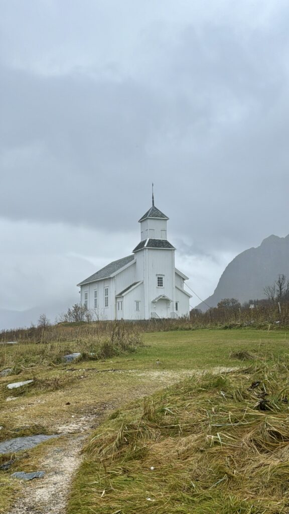 Luego hicimos una parada de unos minutos en Gimsøy Kirke. De nuevo llovía y fue una pena, porque ese lugar es muy bonito y no pudimos disfrutarlo como se merece.