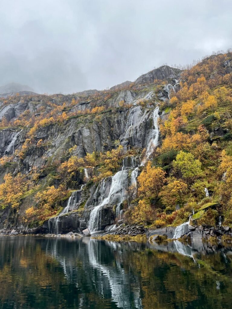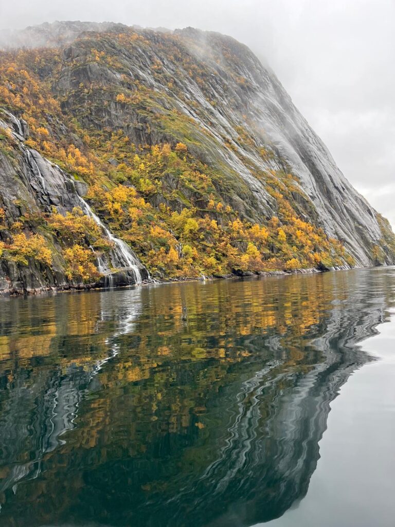 En la novela Todos los arcoíris a tu lado Emma decía que el agua se convertía en un espejo mágico que lo reflejaba todo, y en ese fiordo es como que se refleja mucho más: las montañas emergiendo del mar, de nuevo pintadas con los colores del otoño; las cataratas que descienden por ellas; el silencio; la calma… y ese reflejo tan perfecto que, si se invirtiera la imagen, no te darías ni cuenta.